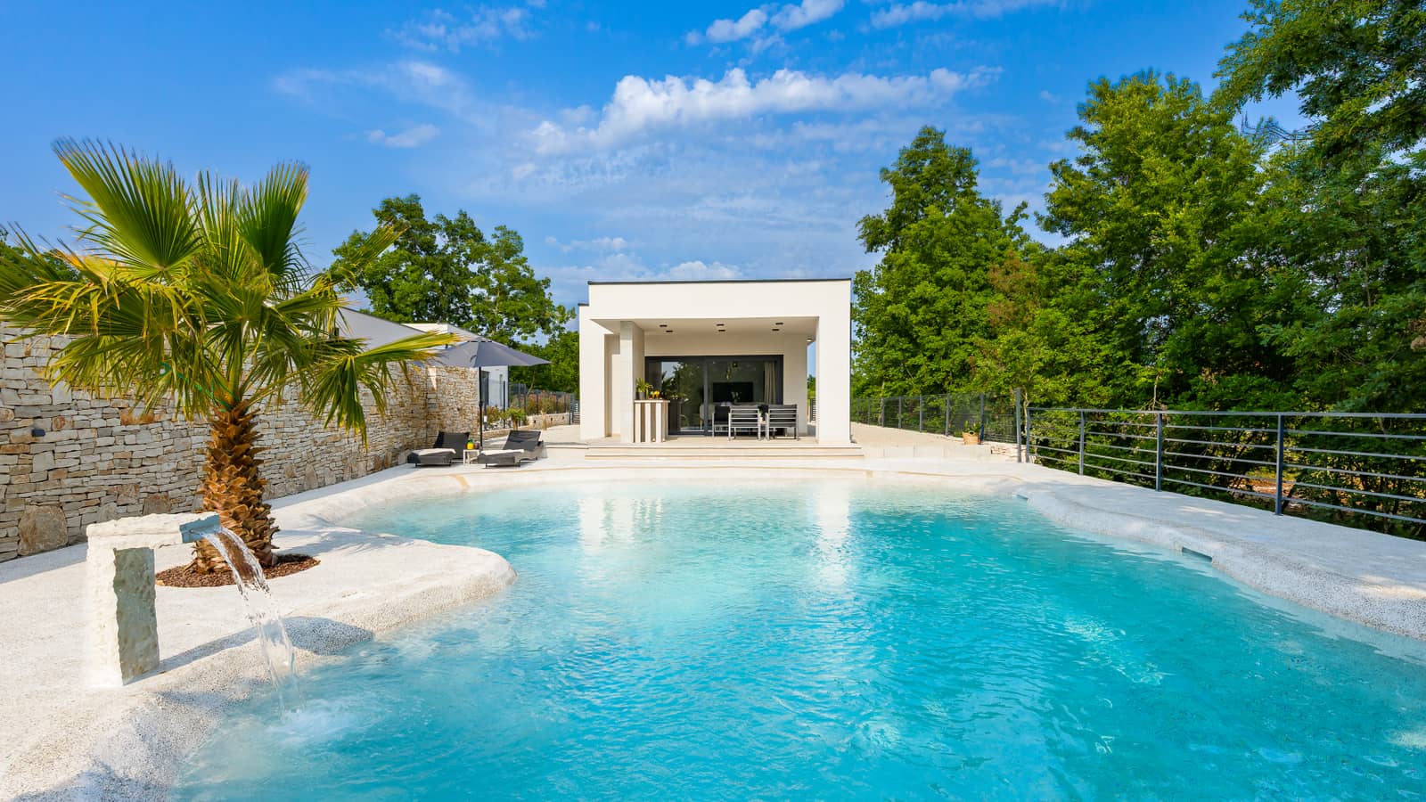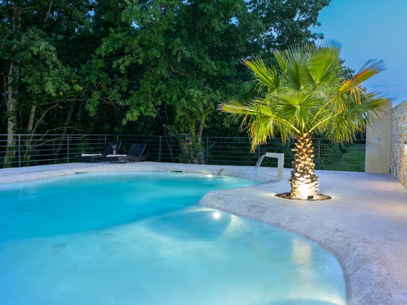 Das Highlight der Villa ist zweifellos der spektakuläre 80 m² große Pool, der in unregelmäßigen, natürlichen Linien geformt ist und an eine Lagune erinnert. Sein Design vermittelt das Gefühl eines exotischen Strandes, während elegante Beleuchtung und Details wie eine Palme und ein Wasserfall das luxuriöse Ambiente unterstreichen. Der Pool lädt zu jeder Tageszeit zum Entspannen ein – vom morgendlichen Schwimmen bis zum abendlichen Genuss bei einem Glas Wein.