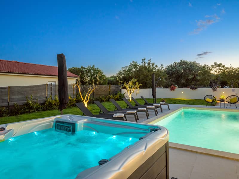 Die Villa verfügt über zwei komfortable Schlafzimmer und zwei moderne Badezimmer, die allen Gästen ausreichend Platz und Privatsphäre bieten. Das Interieur ist sorgfältig gestaltet, um modernen Stil mit Funktionalität zu verbinden und eine gemütliche und entspannte Atmosphäre zu schaffen. Der Außenbereich lädt zum Genießen ein – ein privater Pool, Jacuzzi und ein üppiger Garten ermöglichen vollständige Entspannung im Freien, egal ob Sie sich sonnen oder im Schatten erholen möchten.