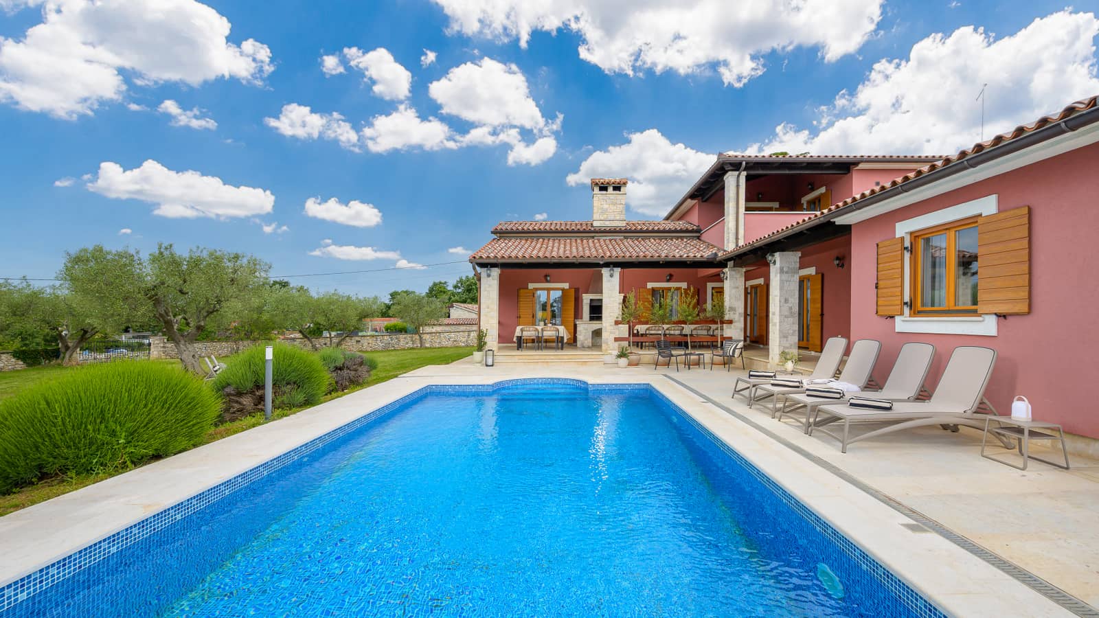 Das Grundstück der Villa erstreckt sich über 1.819 m² und bietet Aktivitäten für alle Altersgruppen: Trampolin, Rutsche und Schaukeln für Kinder sowie ein Volleyballnetz für ältere Gäste. Zum Entspannen und Erfrischen steht ein großer privater Pool mit 40 m² zur Verfügung.