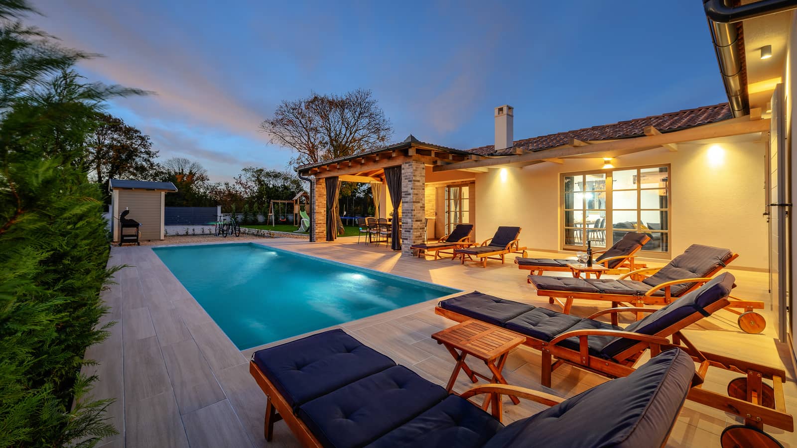 Der großzügige Außenbereich verfügt über einen privaten Pool, ideal zum Abkühlen an heißen Sommertagen, sowie einen Außenessbereich und eine voll ausgestattete Küche für gemeinsame Mahlzeiten im Freien. Für die Kleinen gibt es zahlreiche Spielmöglichkeiten wie Trampolin, Rutsche, kleine Fußballtore, Badminton-Netze und Schaukeln, die Spaß und aktive Zeit garantieren.