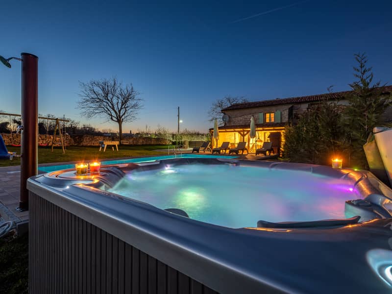 Der Außenbereich begeistert mit einem privaten Pool und Jacuzzi, ideal zum Erfrischen und Entspannen. Familien mit Kindern freuen sich über den Spielplatz, auf dem die Kleinen frei spielen und entdecken können. Der nächstgelegene Strand ist nur 6 km entfernt und bietet einfachen Zugang zum Meer und zu schönen Buchten.