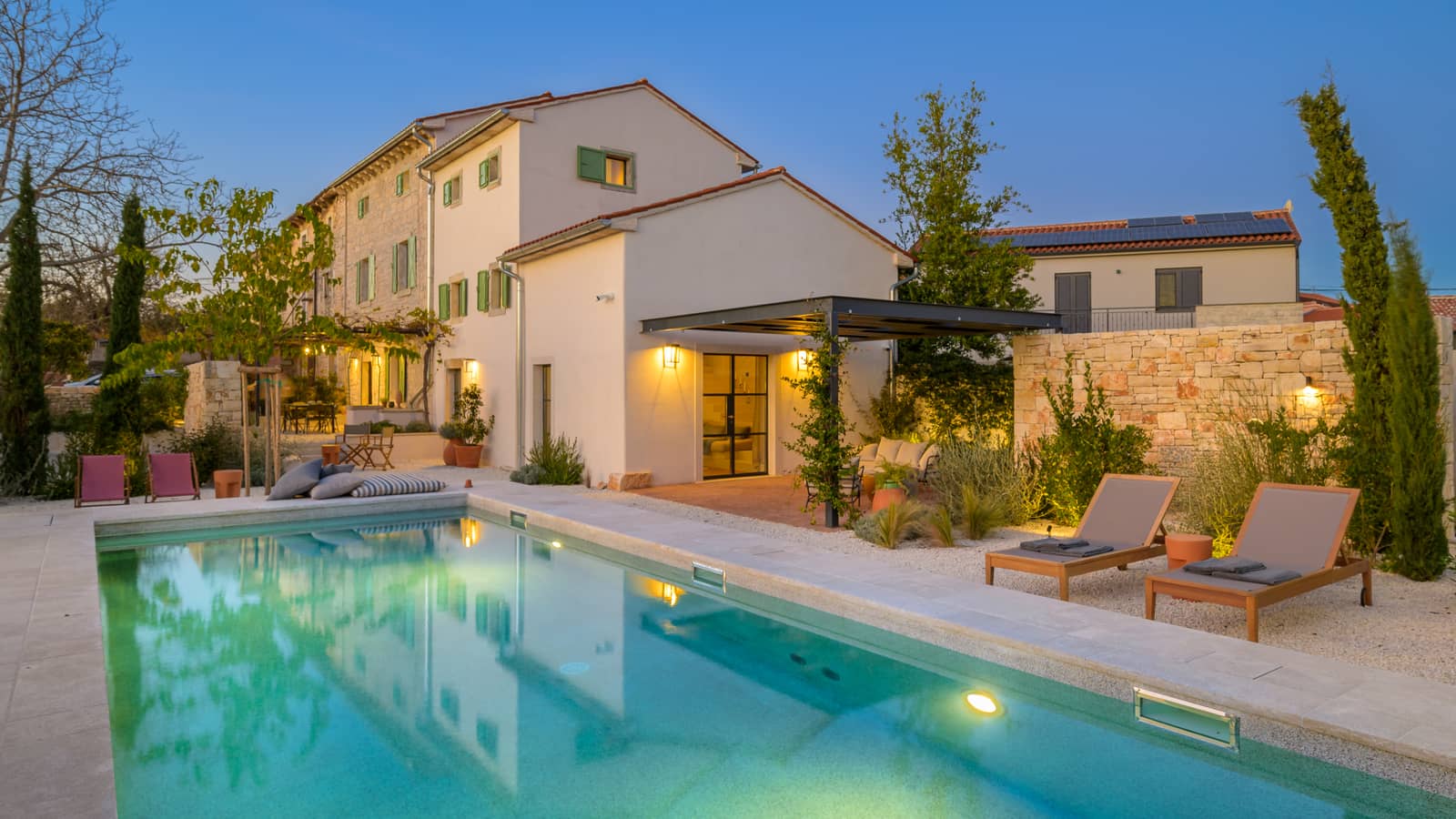 Villa LiliAna consists of two old stone houses connected on the ground floor into a single harmonious unit, historically known as the south and north wings. In the north wing, there is a staircase connecting the two floors with the ground floor, as well as in the south wing. The outdoor spaces are carefully arranged according to the time of day: in the morning, you can enjoy sitting under the grapevine in natural shade; at noon, on the covered terrace with a lounge set; and in the afternoon, it is ideal to sit on cushions in the shade behind the stone wall.