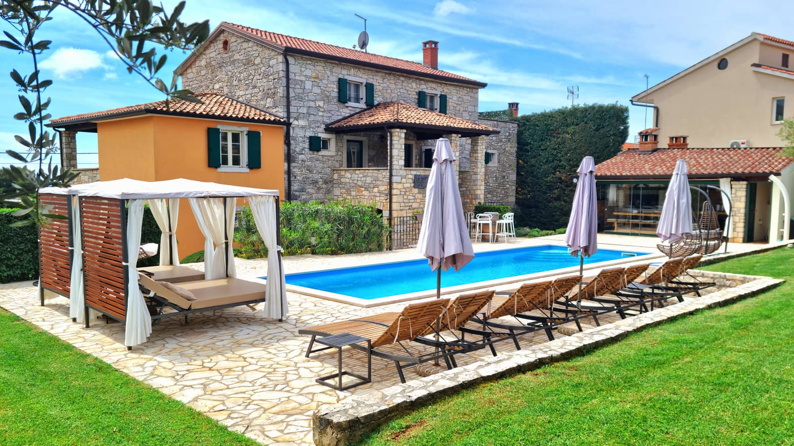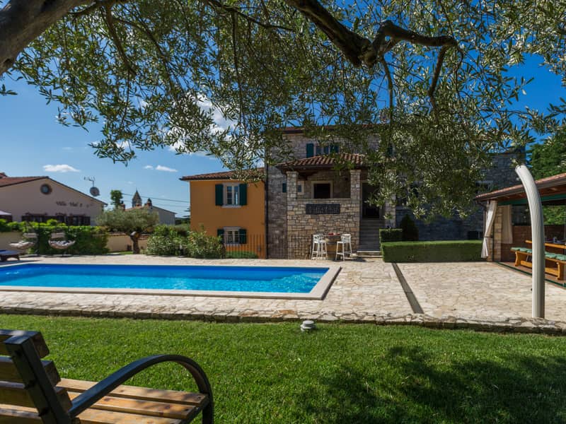 Villa Vial in Kaštelir offers a unique rustic atmosphere with three separate apartments, ideal for large groups and family gatherings. The villa can accommodate up to 14 guests in 6 bedrooms and 7 bathrooms.