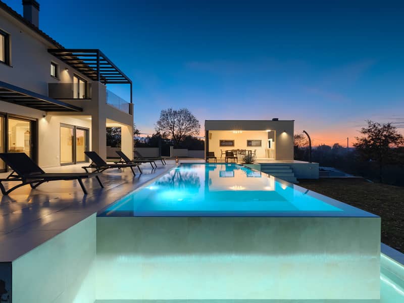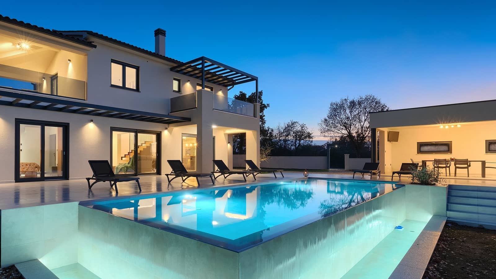 The villa is elegantly and modernly furnished, and its spacious yard features a large infinity pool (35 m²) surrounded by comfortable loungers, an outdoor kitchen, and a dining area — the perfect place to enjoy your morning coffee or relax by the pool.