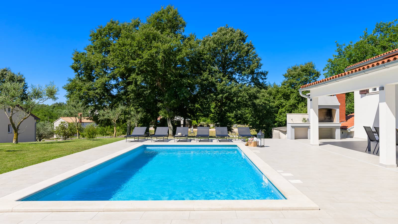 In the spacious yard, there is a private pool, sun loungers, and a charcoal grill - a perfect place for relaxation and socializing in the fresh air.