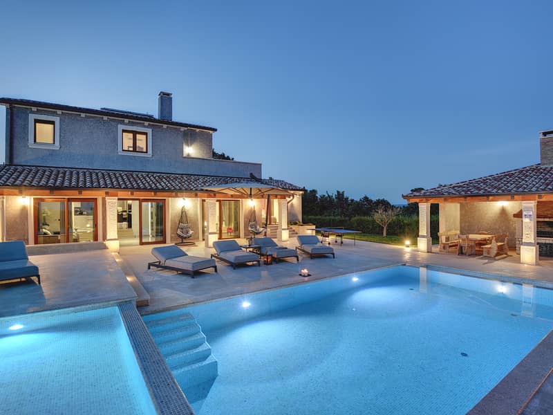 Vila ima 5 modernih spavaćih soba (4 imaju vlastitu kupaonicu), od kojih su 3 u prizemlju, a 2 na prvom katu. Svaka soba ima svoj TV i klimu. U dnevnom boravku ćete pronaći veliki otvoreni prostor s prekrasnim pogledom na bazen i vanjski prostor, savršeno mjesto za stvaranje uspomena. Kuhinja je kompletno opremljena, a u sklopu nje se nalazi i blagovaonica, opremljena velikim stolom. Vila je potpuno klimatizirana, nudi Wi-Fi pristup internetu i privatni parking.