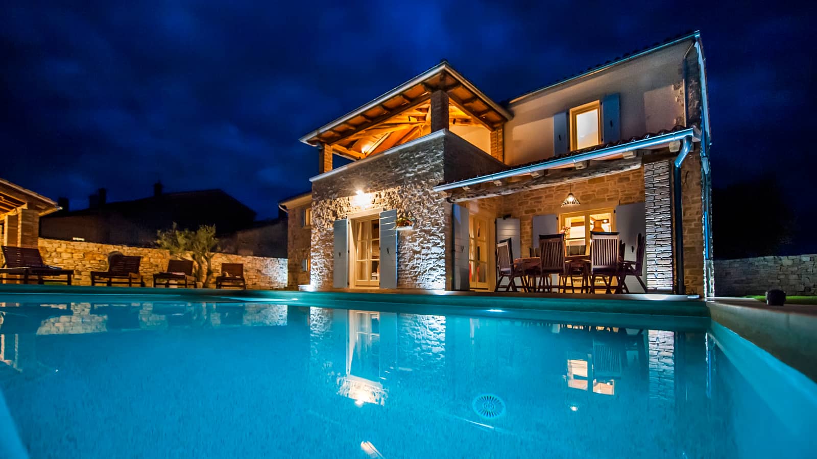 U uređenom dvorištu nalazi se pravi raj - veliki privatni bazen površine 43 m², jacuzzi, vanjska ljetna kuhinja s blagovaonicom i roštilj, idealni za ugodne ljetne večeri u društvu.