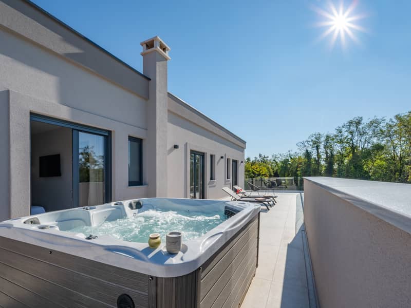 Na potpuno ograđenom zemljištu možete uživati u privatnom bazenu, jacuzziju za pet osoba te ljetnoj kuhinji s roštiljem, savršenoj za pripremu ukusnih obroka na otvorenom. Za zabavu tu je igraonica opremljena biljarom i stolnim nogometom, koja će oduševiti i odrasle i djecu.