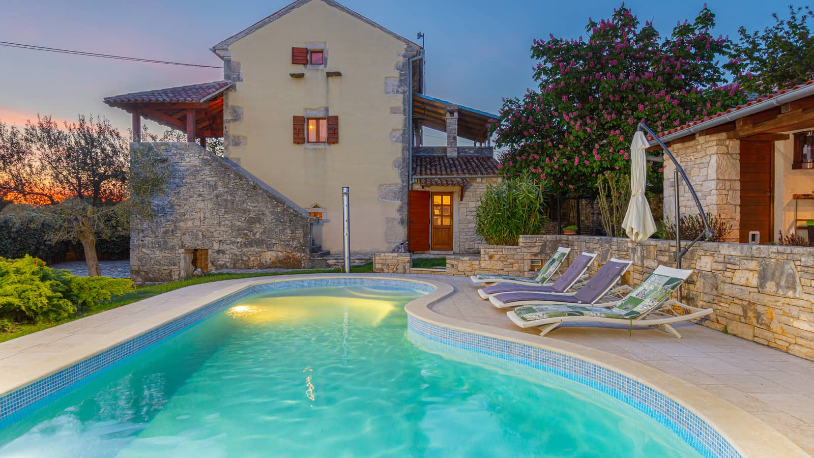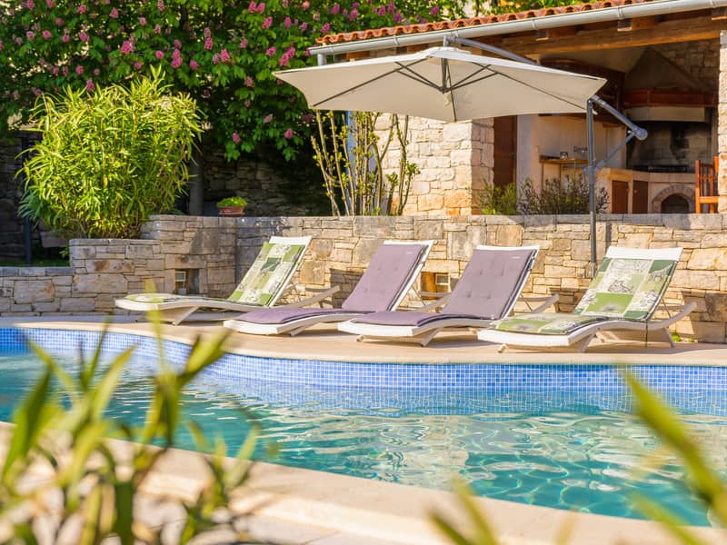 U prostranom dvorištu nalazi se privatni bazen površine 43 m² te prostrana ljetna kuhinja od 48 m² s otvorenim roštiljem, sudoperom, frižiderom i plinskim kuhalom. Vanjska kuhinja također uključuje dodatni frižider za vina s kapacitetom od 48 boca, veliki stol i udobnu sjedeću garnituru. Okruženje dodatno krasi 20 stabala istarskih maslina. Gostima je na raspolaganju i dodatni bazen za psa, a uz dvorište se nalazi i originalno boćalište.