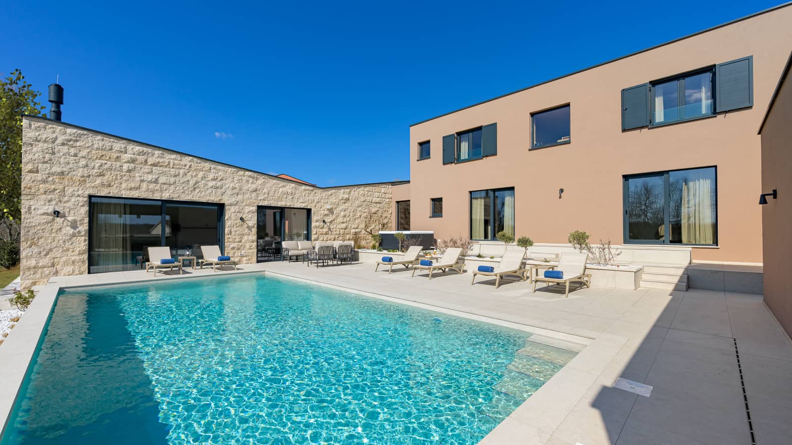 Vila ima četiri moderne spavaće sobe, svaka opremljena klima-uređajem, TV-om i vlastitom kupaonicom, što osigurava maksimalnu udobnost i privatnost za sve goste.