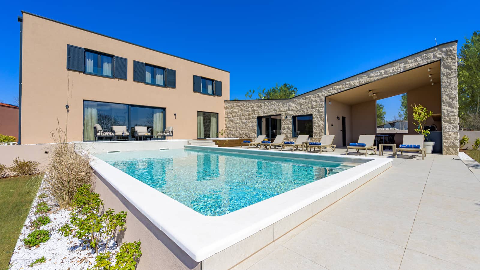 Vila ima pet modernih spavaćih soba, svaka opremljena klima-uređajem, TV-om i vlastitom kupaonicom, što osigurava maksimalnu udobnost i privatnost za sve goste.