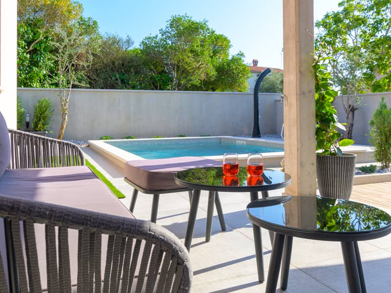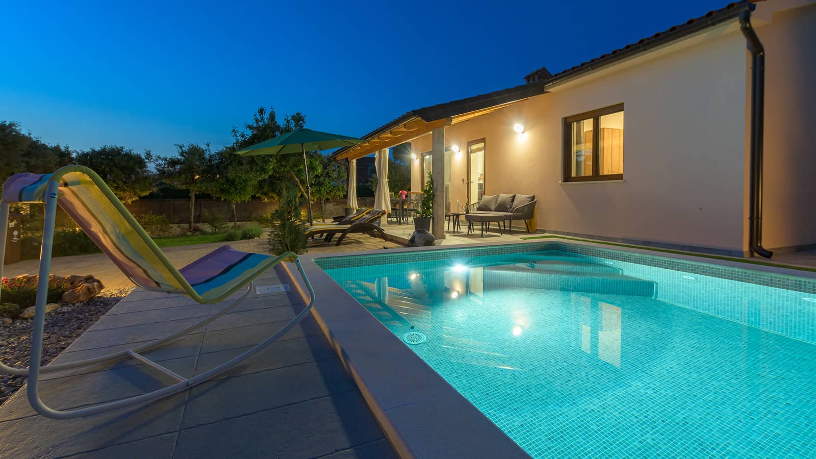 U prostranom dvorištu nalazi se grijani bazen, roštilj, vanjska blagovaonica i 4 ležaljke, savršeni za opuštanje i uživanje na otvorenom.