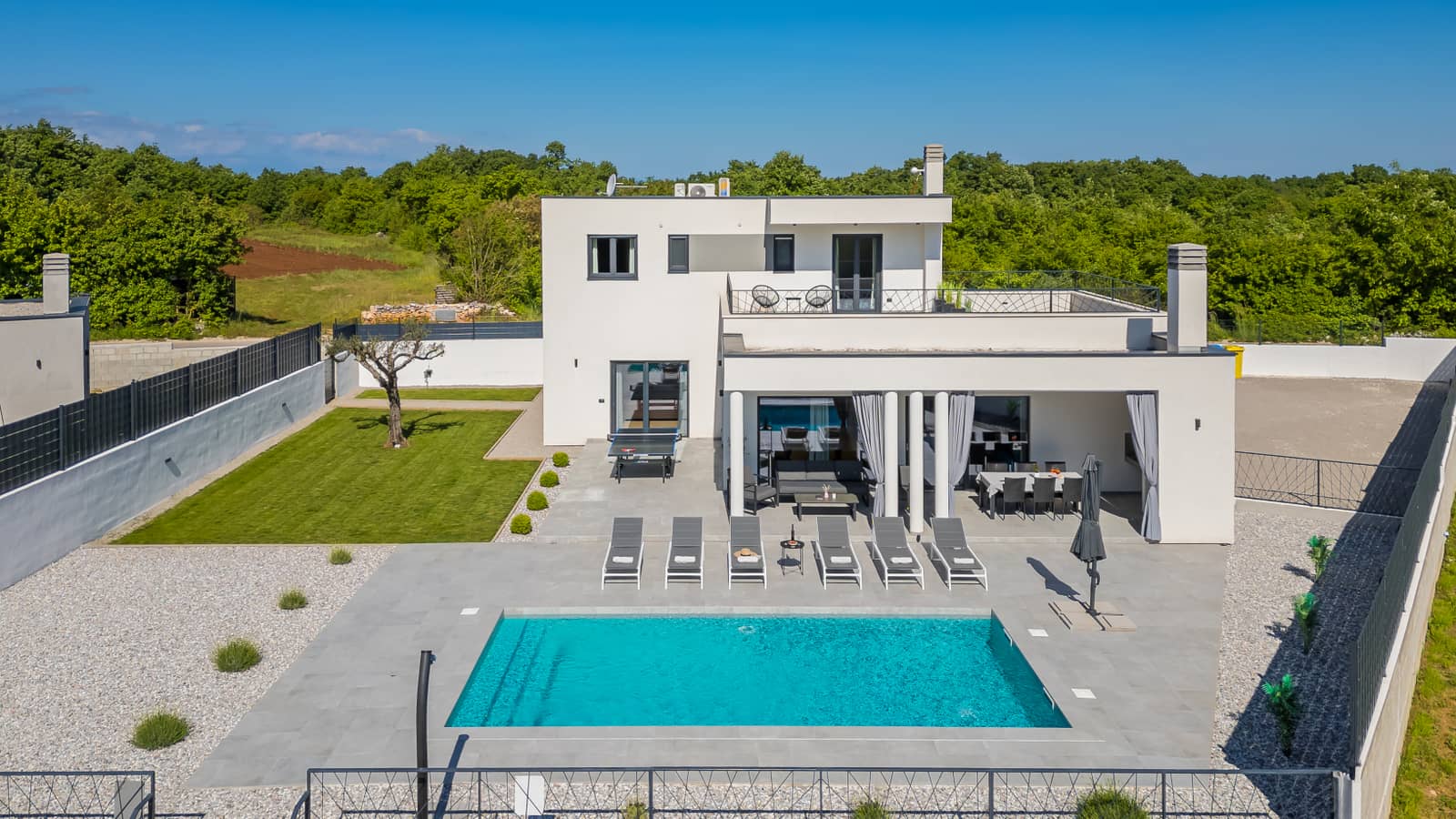Vanjski prostor vile prava je oaza za opuštanje i zabavu - uživajte na ležaljkama uz bazen ili pripremite ukusne obroke na roštilju.