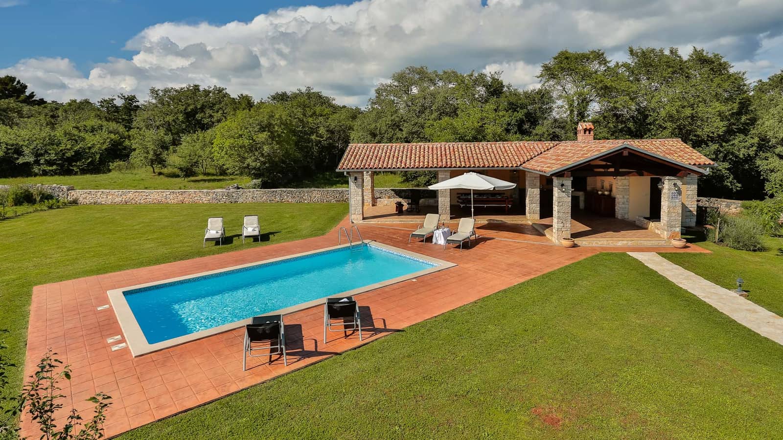 Vanjski prostor vile oduzima dah svojom ljepotom i funkcionalnošću. Okružen zelenilom, prostrani vrt nudi potpuni osjećaj privatnosti. U njemu se nalazi bazen okružen udobnim ležaljkama, stvarajući idealno mjesto za opuštanje i uživanje na suncu. Tu je i natkrivena terasa opremljena ljetnom kuhinjom i roštiljem na ugljen, gdje se možete prepustiti pripremi ukusnih jela ili jednostavno uživati u nezaboravnim trenucima s obitelji i prijateljima.