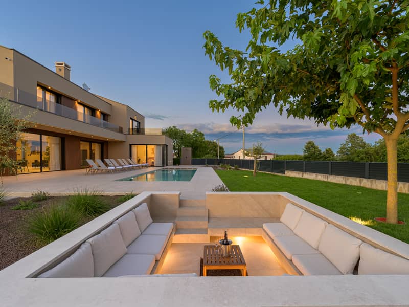 Posebnu čar daje uređeno dvorište, gdje se nalazi outdoor lounge prostor, savršen za večernja druženja, čašu vina pod zvjezdanim nebom ili jednostavno uživanje u prirodi. Lounge zona skladno se uklapa u prostor vile, dodajući dozu autentičnosti cijelom imanju.