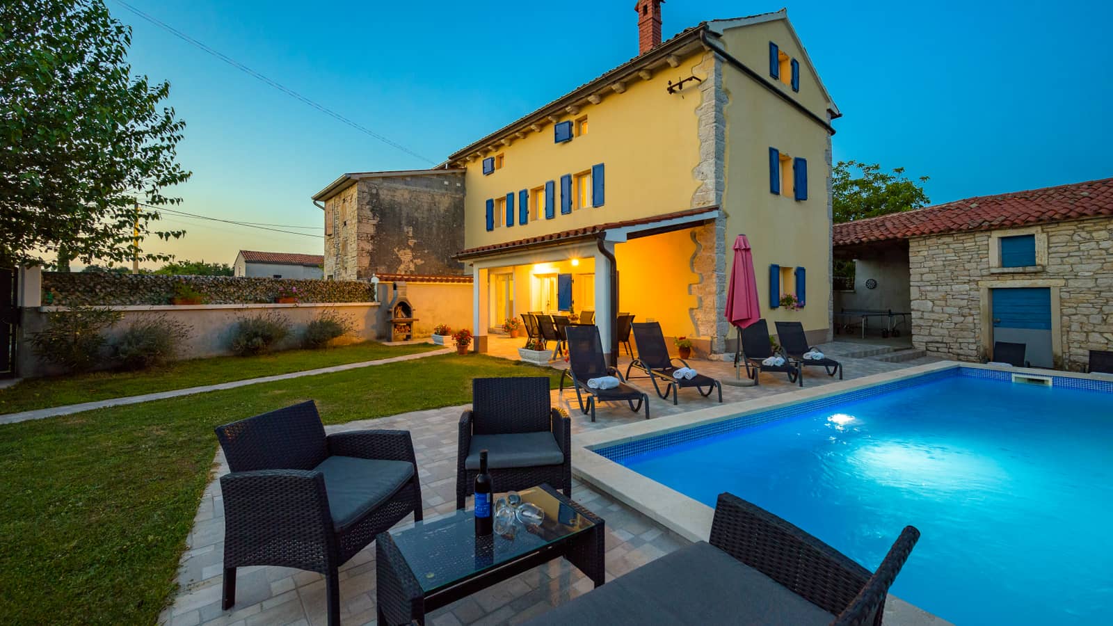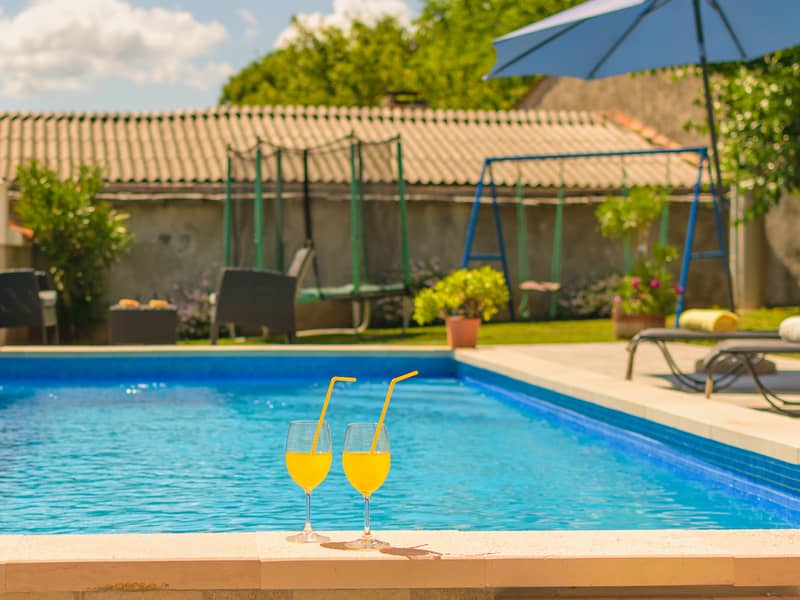 U ograđenom dvorištu nalazi se bazen s natkrivenom terasom i roštiljem, savršen za opuštanje i druženje na svježem zraku. Prostor oko bazena nudi ležaljke za sunčanje i udobno mjesto za uživanje u toplim ljetnim danima.
